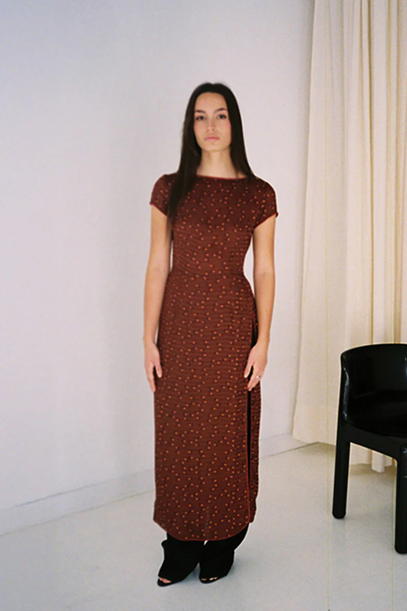 Long dress with short sleeved dress in brown with a unique pattern, designed by our in-house design team, ensuring it is entirely original and distinctive.
