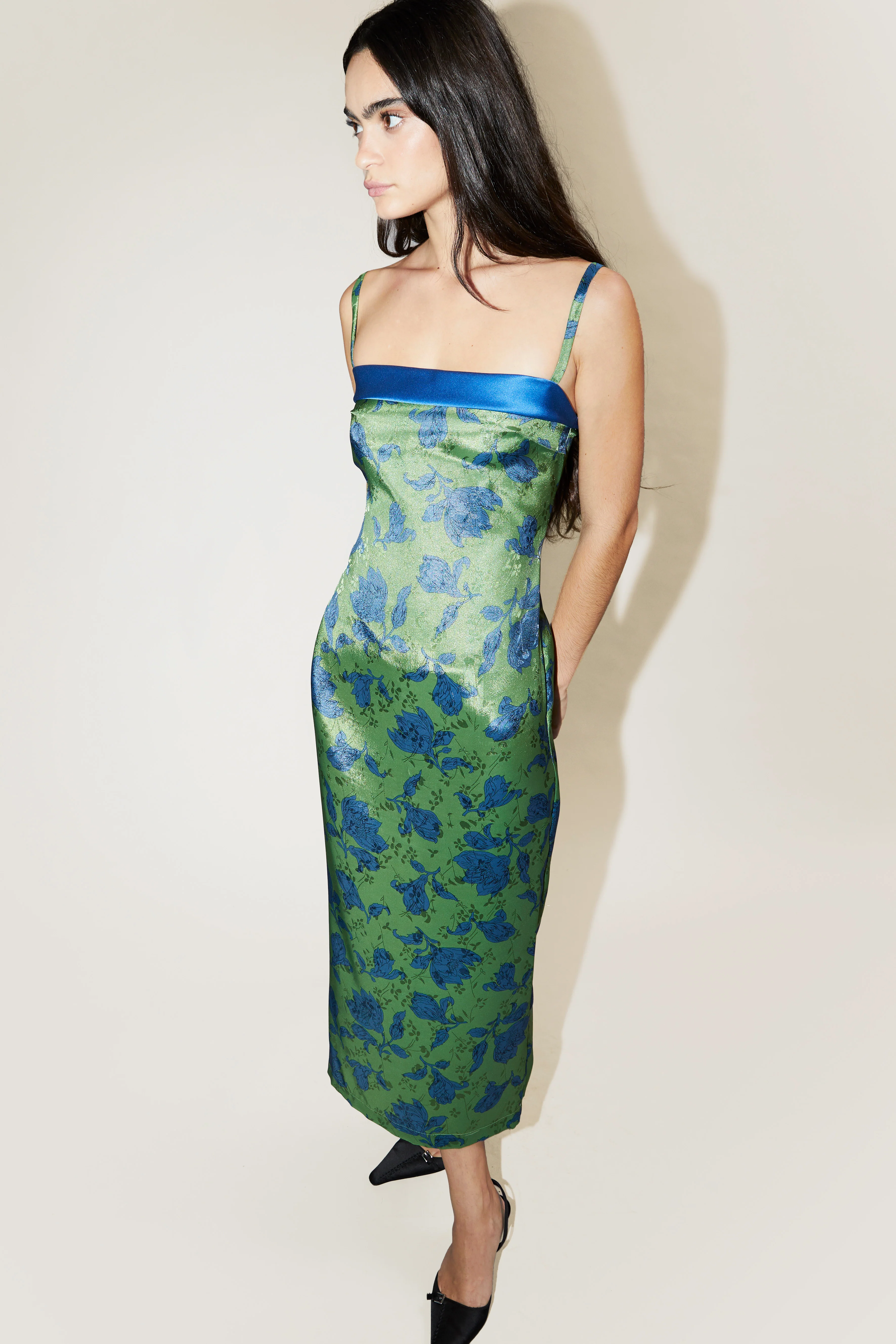 Long dress in green with blue-flowered pattern.